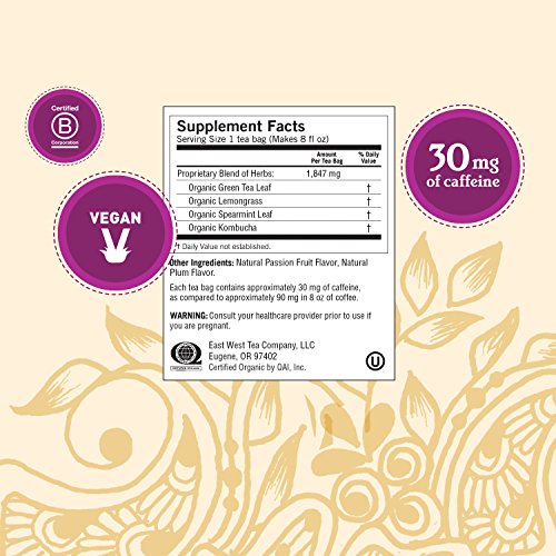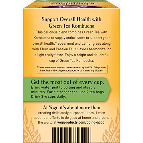 Details: Support Overall Health with Green Tea Kombucha Bright and delightful, Yogi Green Tea Kombucha tea is uniquely formulated to support overall health. This delicious blend combines Green Tea with Kombucha to supply antioxidants, while Spearmint and Lemongrass harmonize with Plum and Passion Fruit flavors for a light, fruity taste. Enjoy a bright and delightful cup of Yogi Green Tea Kombucha tea. *These statements have not been evaluated by the FDA. This product is not intended to diagnose, treat, cure, or prevent any disease.